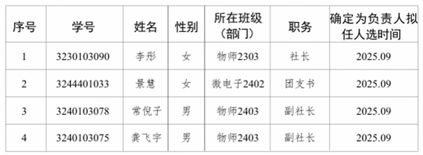 经提名推荐和民主选举,百家乐预测软件 团委(团总支)审核考察,拟推荐李彤、景慧等4位社团成员作为2025-2026学年大学物理实验协会学生负责人拟任人选。现将李形、景慧等4位社团成员基本情况公示如下,如有意见和建议,请于9月3日前向学院团委(团总支)反映。