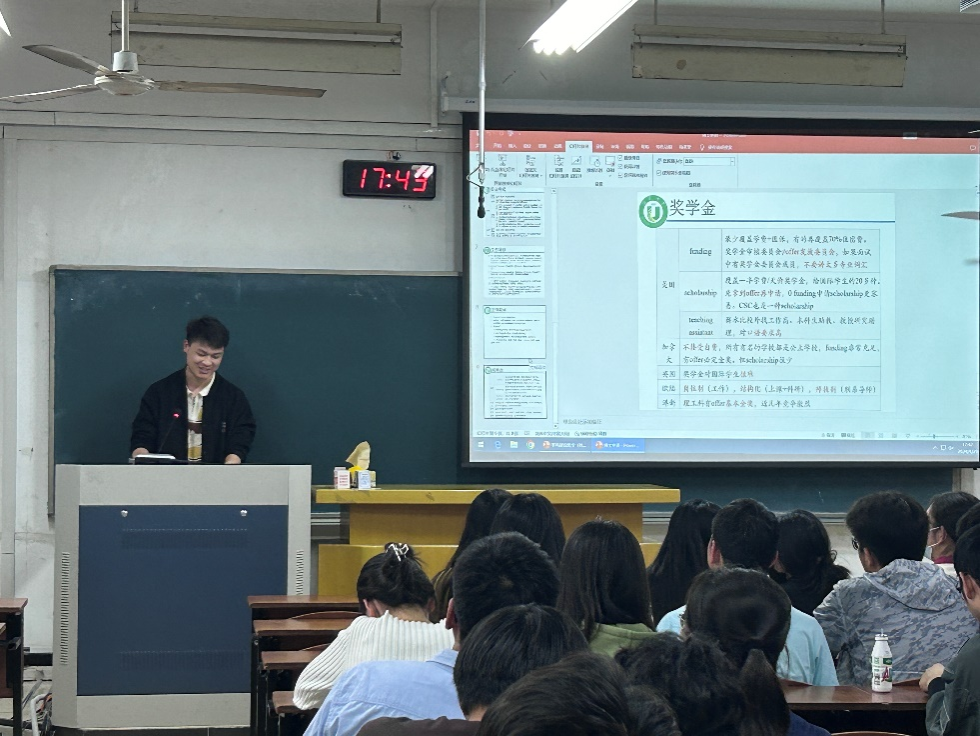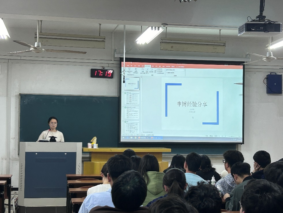 随后,王冰冰同学为同学们分享了申博流程,从选择合适的学校、导师,到博士期间的发展规划,为同学们提供了宝贵的建议;汤涵同学则结合自身申博经历,向同学们强调了申博的注意事项。