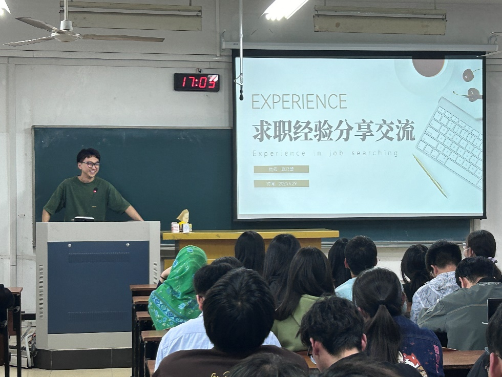 首先,王姣姣同学结合自身求职经历,向同学们传授了应聘国有企业的宝贵经验,详细讲解了应聘国有企业的流程与技巧,包括简历制作、实习经验积累以及面试准备等;陈泽人同学向同学们介绍了应聘选调生的相关流程,包括如何选择合适的岗位,如何备考等,并向同学们分享了自己在等待结果期间所做的其他准备;庞乃琦同学则聚焦于求职过程,分享了面对不同企业时简历制作和面试的注意事项,以及丰富个人项目经历的方法。