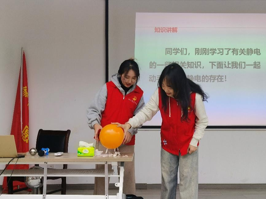 此外,志愿者们还邀请同学上台参与实验,在讲解静电原理的基础上,志愿者们还为同学们解答了一些生活中常遇到的静电问题。例如,在冬天干燥的天气里,人们可以通过保持皮肤湿润、穿棉质衣物等措施来减少静电的产生;梳头发时,头发炸毛的现象可以通过使用木梳子或将塑料梳子置于水中来解决……