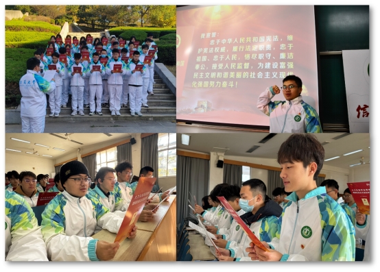 宪法是国家的根本大法,是治国安邦的总章程。在学院的组织下,同学们在教学楼和“一站式”学生社区,开展“宪法晨读”、“宪法宣誓”、传唱歌曲《宪法伴我们成长》,各班级学生骨干组织同学们学习《中华人民共和国宪法》,了解《中华人民共和国宪法》的重要地位和作用。