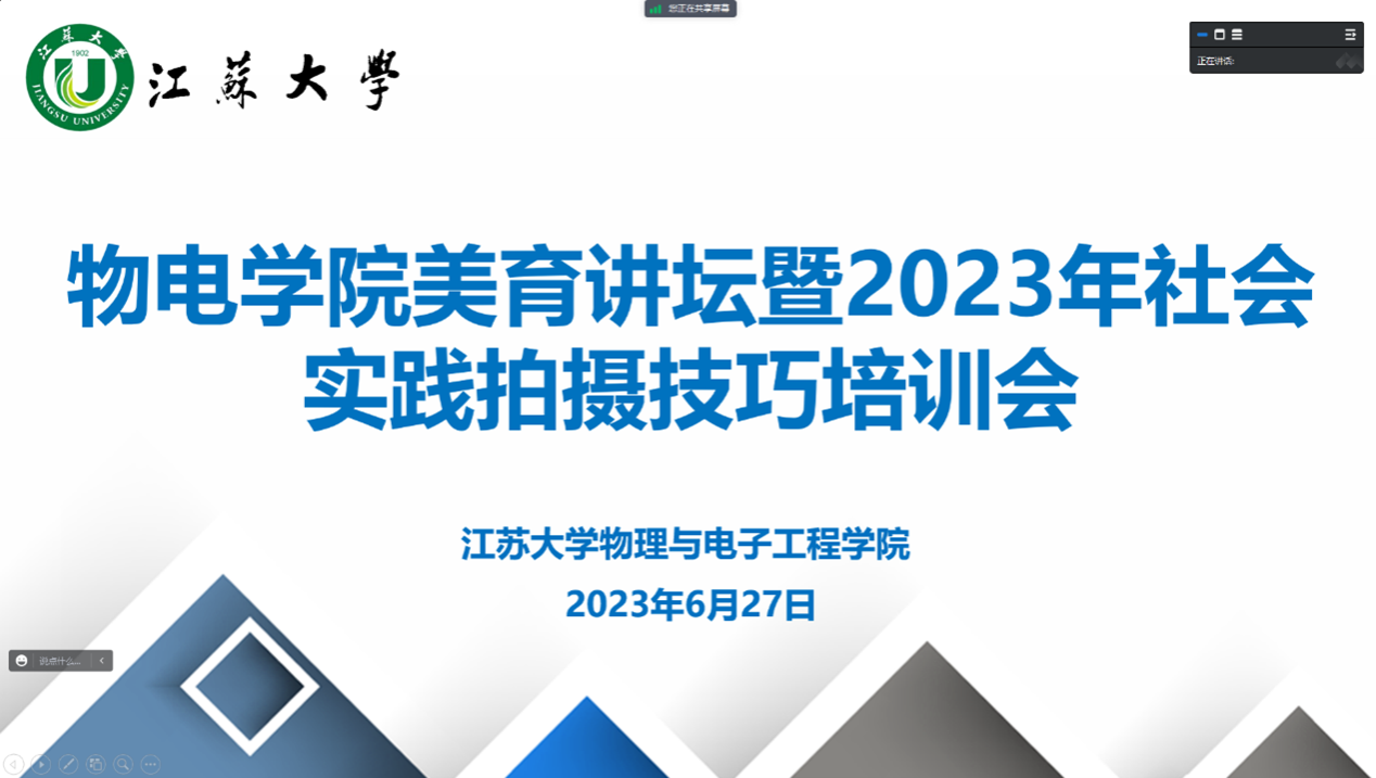 627,由江苏大学公共艺术教育中心、百家乐预测软件 承办的“美育讲坛暨2023年社会实践拍摄技巧培训会”在线上举行。本次讲座特邀请江苏大学党委宣传部正科级秘书,新华社、中新社、CFP签约摄影师,《新华日报》特约摄影通讯员杨雨主讲,百家乐预测软件 全体学生参与。讲座由辅导员刘振主持。