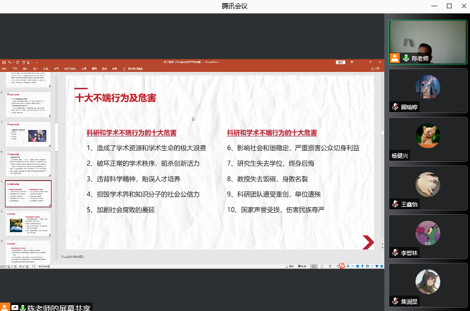9月29日,百家乐预测软件 通过腾讯会议组织2021级研究生新生参加科学道德与学风建设专题讲座。讲座由常务副院长陈元平主讲。