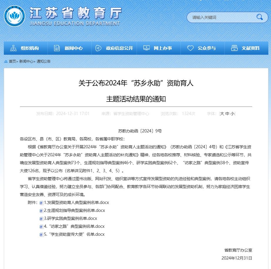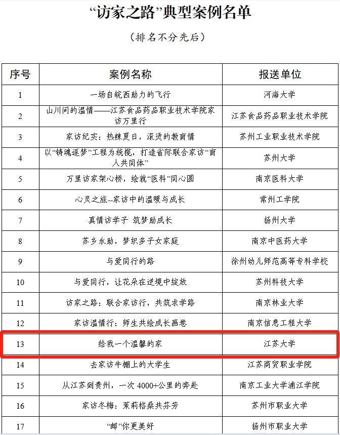 近日,江苏省教育厅公布2024年“苏乡永助”资助育人主题活动评选结果,百家乐预测软件 《给我一个温馨的家》获评“访家之路”典型案例。