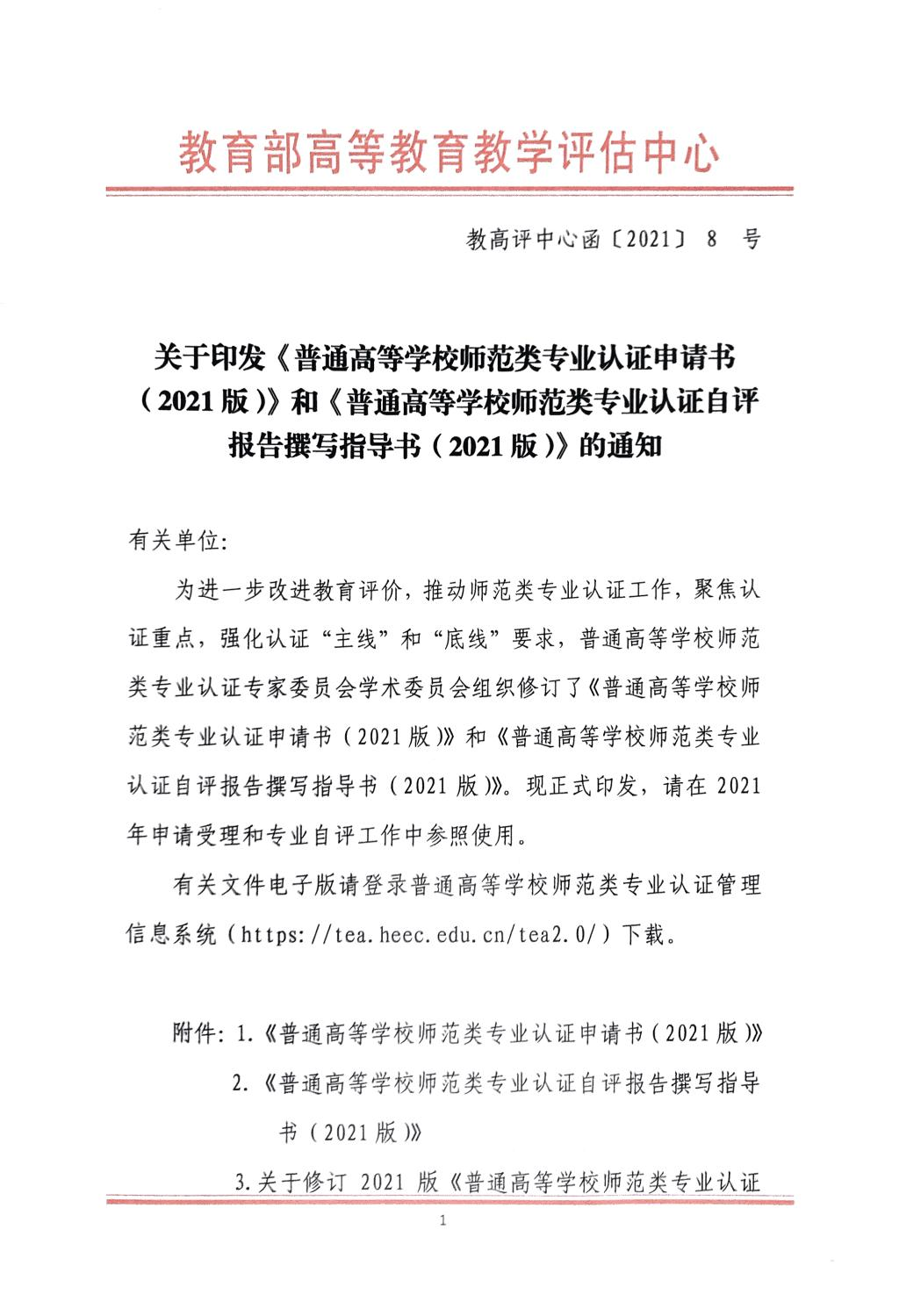 关于印发《普通高等学校师范类专业认证申请书(2021版)》和《普通高等学校师范类专业认证自评报告撰写指导书(2021版)》的通知