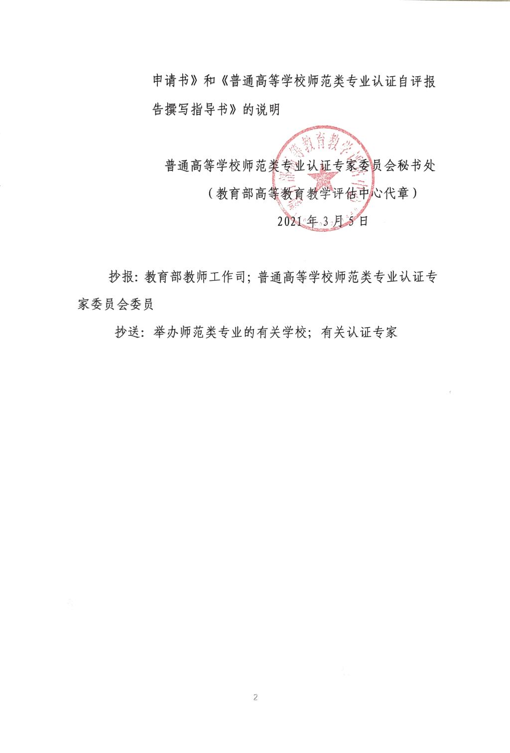 普通高等学校师范类专业认证专家委员会秘书处(教育部高等教育教学评估中心代章)2021年3月5日