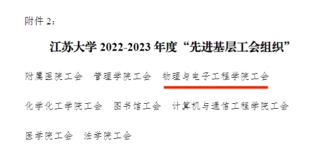 Under the correct leadership of the University Union and the College Party Committee, the Union of the College of Physics and Electrical Engineering adheres to the guidance of Xi Jinping Thought on Socialism with Chinese Characteristics for a New Era. It unites and leads all faculty and staff members, upholding the path of development for trade unions with Chinese characteristics, conscientiously performing the four basic functions of “maintenance, construction, participation, and education,” playing a role as a bridge and link, and mobilizing the broad masses of faculty and staff to take ownership and contribute to the creation of a “double first-class” institution. The College Union was honored with the title of "Model Employee Small Home" in Zhenjiang City in 2022 (the only one in the entire university), won the Grand Prize in the Zhenjiang Education Union Speech Contest, and has ranked fourth in total scores for faculty and staff competitive events at the university sports meet for two consecutive years. It also won third prizes in the university fitness dance, Tai Chi fan, tug-of-war, and Chinese classic recitation competitions.