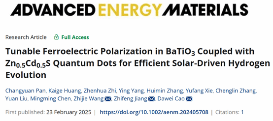 Recently, graduate students from our school have published a research paper titled "Tunable Ferroelectric Polarization in BaTiO₃ Coupled with Zn₀.₅Cd₀.₅S Quantum Dots for Efficient Solar-Driven Hydrogen Evolution" in Advanced Energy Materials, a top journal in the energy field. Pan Changyuan, a master’s student of our school, is the first author of the paper. The corresponding authors are Professor Cao Dawei from our school, Professor Jiang Zhifeng from the Energy Research Institute, and Professor Wang Zhijie from the Institute of Semiconductors, Chinese Academy of Sciences (CAS). Jiangsu University is the first completing unit.